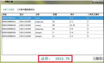 結(jié)算功能:系統(tǒng)可采用掃描槍掃描商品上的二維碼實現(xiàn)結(jié)算,語音播報當(dāng)前結(jié)算總額。也可以使用設(shè)置的超高頻讀卡器完成貨物(帶有超高頻標(biāo)簽)的自動結(jié)算功能。即將多件帶有超高頻標(biāo)簽的貨物同時經(jīng)過超高頻讀卡器,系統(tǒng)會自動將貨物名稱和單價以及總價顯示出來,并通過語音播放器播報商品總價。