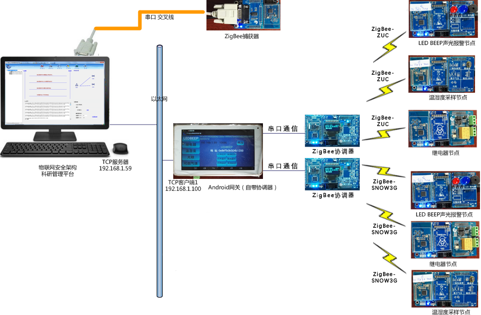 5.數(shù)據(jù)處理與加解密網(wǎng)關(guān):支持感知層采樣數(shù)據(jù)的解析顯示、控制命令的下發(fā);支持五種輕量級(jí)加密算法,可任選,并采用TCP通信協(xié)議與PC端應(yīng)用程序進(jìn)行數(shù)據(jù)交互。