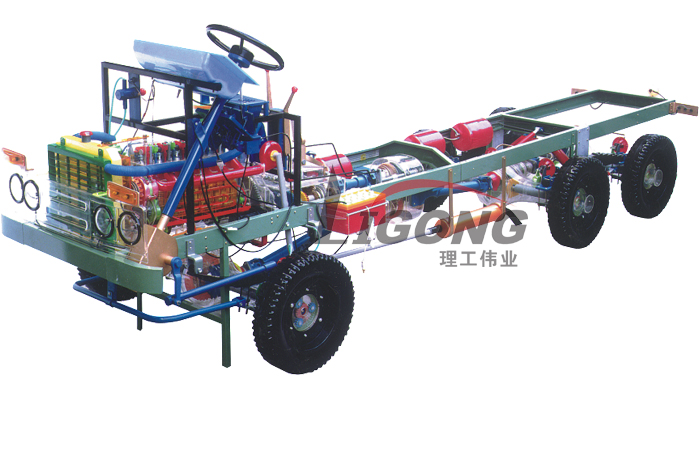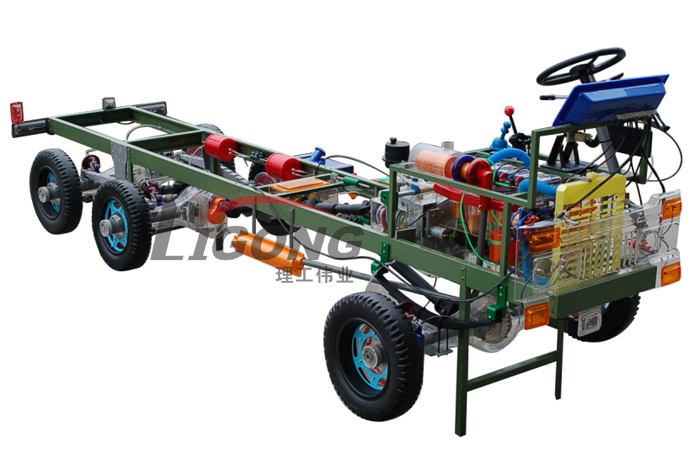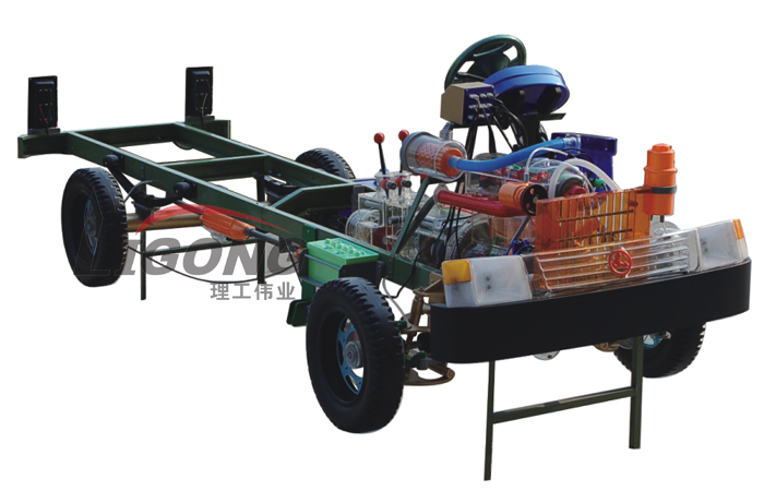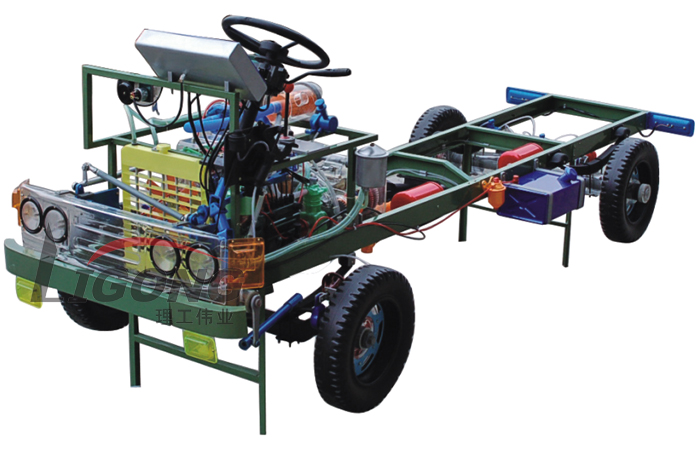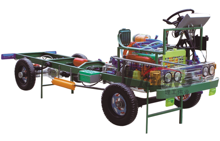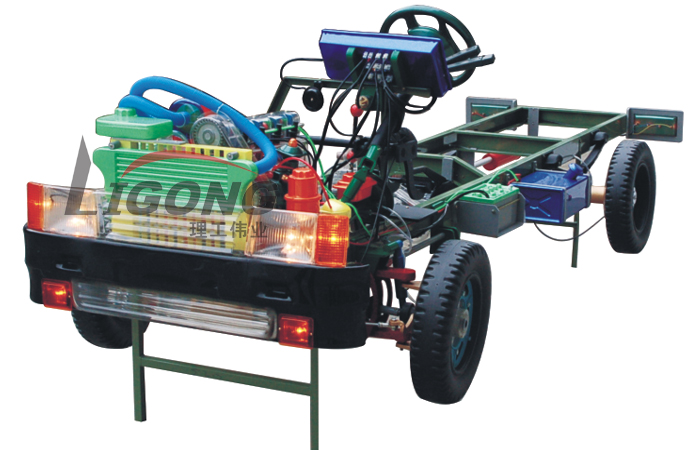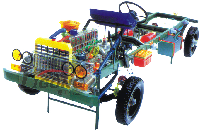 本品選用透明有機(jī)玻璃制作,內(nèi)中部件均以硬質(zhì)塑料料加工,用 螺絲固定在金屬高溫烘漆而成的車架上。各總成部分都以壓模成形加 工,代替過去膠粘合的方法,使產(chǎn)品在強(qiáng)度上有很大提高。發(fā)動機(jī)總成用電機(jī)驅(qū)動,在油門處設(shè)有調(diào)速裝置,能演示發(fā)動機(jī)轉(zhuǎn)速高低。離合器分離明顯,操縱靈活,離合器外殼整體壓模而成,變速箱和各檔齒輪用各種顏色表示,換檔靈活,手制動美觀。后橋外形壓模而成,內(nèi)中主減速、差速轉(zhuǎn)動自如,輪轂剎蹄壓模成型,剎蹄可調(diào)節(jié),前橋輪鼓可調(diào)整,轉(zhuǎn)向裝置以及電瓶、油箱、水箱,制動管路分布清楚一目了然。電路采用對插件前后分布,燈架、風(fēng)窗、儀表板、后燈架用透明有機(jī)玻璃壓模成整體美觀逼真。