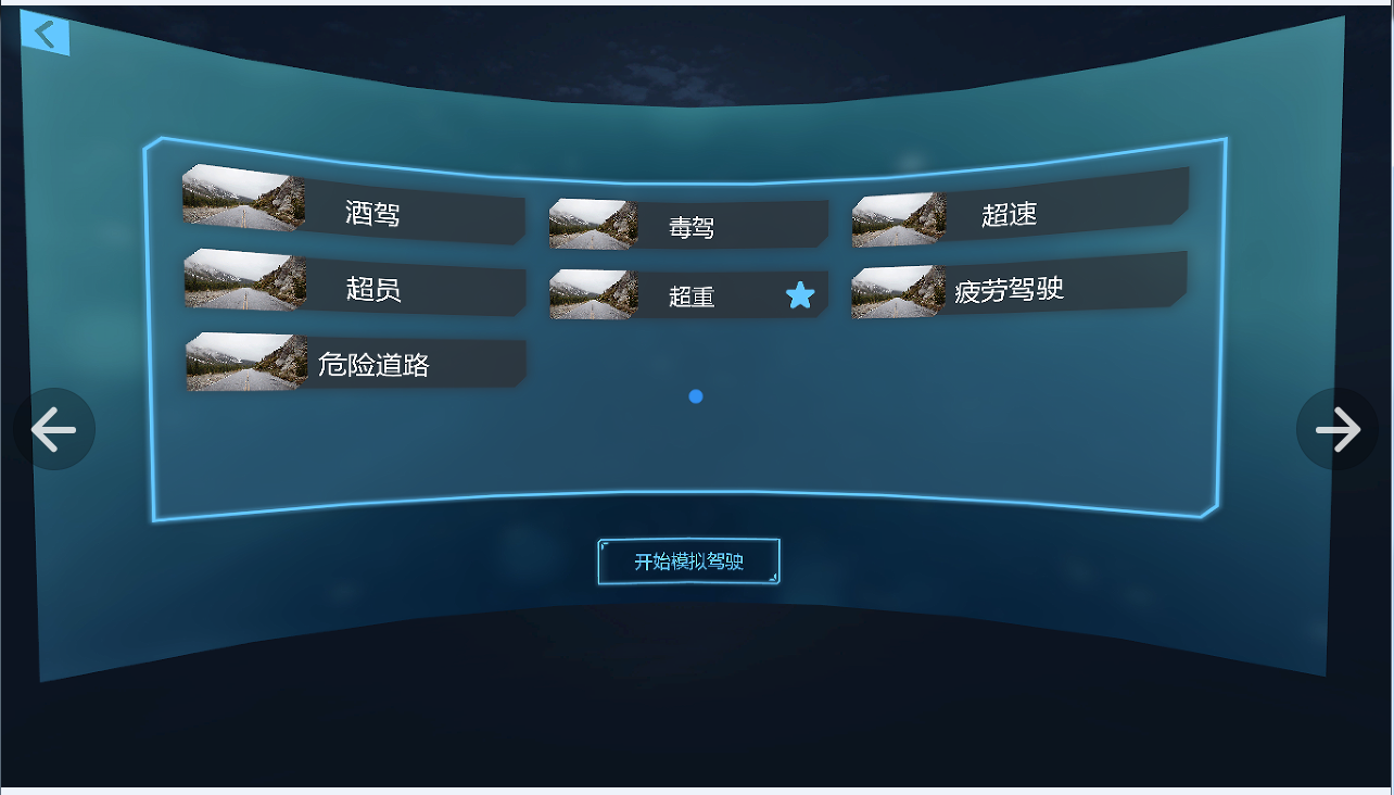 1VR動(dòng)畫交互:酒駕模擬體驗(yàn)、毒駕模擬體驗(yàn)、超速模擬體驗(yàn)、超員模擬體驗(yàn)、超載模擬體驗(yàn)、疲勞駕駛模擬體驗(yàn)、危險(xiǎn)道路模擬體驗(yàn)、緊急避讓模擬體驗(yàn);