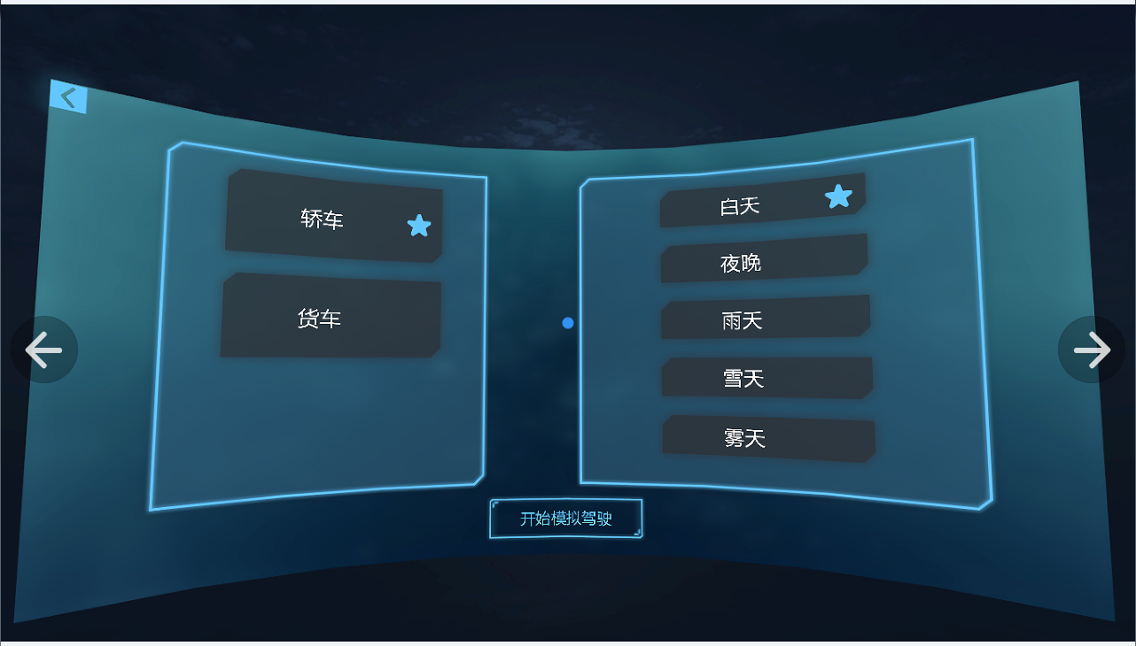 2、模擬駕駛系統(tǒng):天氣選擇(白天、夜晚,雨天,雪天、霧天) 、科目場(chǎng)地選擇(倒車入庫(kù),坡道定點(diǎn)停車和起步,側(cè)方停車,曲線行駛,直角拐彎,公路,十字路口,)、車型選擇(大貨車,小轎車)