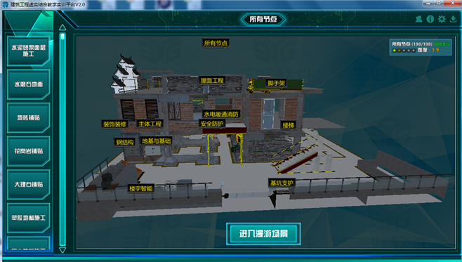2. 建筑工程虛擬仿真教學(xué)軟件系統(tǒng)可通過漫游模式或點(diǎn)擊對應(yīng)菜單進(jìn)入仿真程序,并在進(jìn)入程序后可進(jìn)行相互切換。