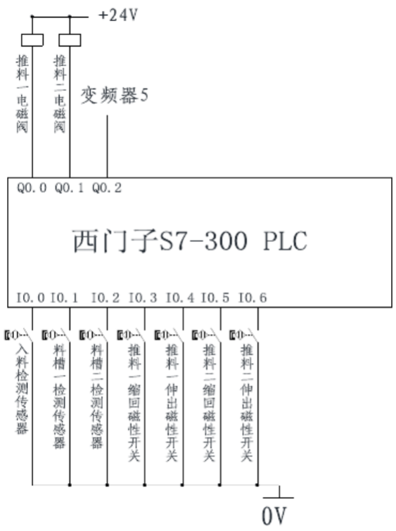 系統(tǒng)啟動,將物料放到光電傳感器前的皮帶上,當(dāng)光電傳感器檢測到有工件進入,即給控制系統(tǒng)發(fā)出信號,控制系統(tǒng)給變頻器發(fā)出啟動信號。變頻器驅(qū)動三相交流電機帶動皮帶轉(zhuǎn)動,當(dāng)物料為金屬時電感傳感器檢測到信號,變頻器停止,推料氣缸一動作,將物料推入第一個料槽;當(dāng)物料為非金屬時電容傳感器檢測到信號,變頻器停止,推料氣缸二動作,將物料推入第二個料槽。