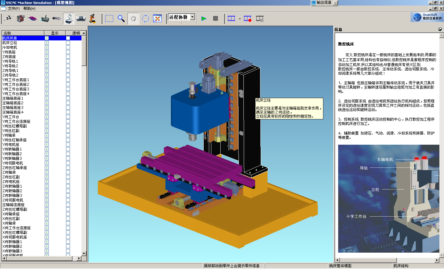 (2) 軟件具有數控車床和銑床的機械結構展示(要求做到每一個機械部件)的3D顯示。銑床包括整機結構、主軸箱總成、伺服總成、絲桿連接總成、Z軸總成等。