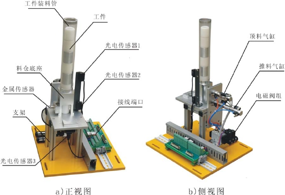 | 8 | 供料機(jī)構(gòu) | 主要由井式工件庫(kù)、推料氣缸、物料臺(tái)、光電傳感器、磁性開(kāi)關(guān)、電磁閥、支架、機(jī)械零部件構(gòu)成。 | 1套 |