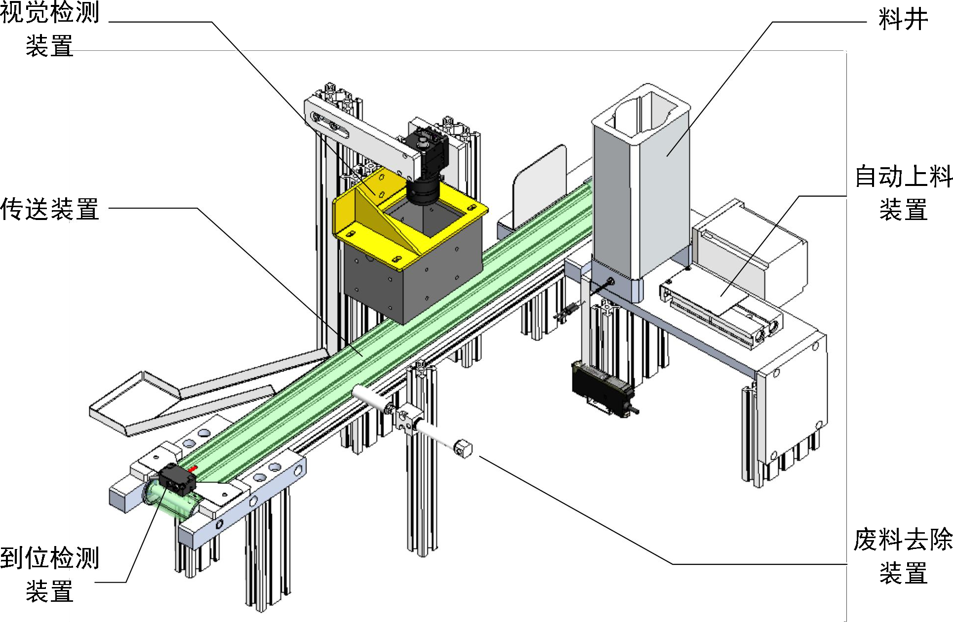 多功能料井為鋁合金材質(zhì),可兼容正方形、長(zhǎng)方形和圓形三種形狀的物料塊以固定的姿態(tài)到達(dá)料井底部,料井底部設(shè)置有反射型光纖傳感器,當(dāng)傳感器檢測(cè)到有物料落下時(shí),觸發(fā)自動(dòng)上料裝置,雙軸氣缸將物料推送到傳送裝置上。傳送裝置上電機(jī)配合精密減速器驅(qū)動(dòng)傳送帶模擬真實(shí)工廠(chǎng)的流水線(xiàn),在流水線(xiàn)的中間設(shè)置有視覺(jué)檢測(cè)裝置,檢測(cè)合格產(chǎn)品可以到達(dá)傳送帶的末端,不合格產(chǎn)品作為廢料,由廢料去除裝置推出傳送帶。在傳送帶末端配有精密傳感器感應(yīng)產(chǎn)品是否到位。
