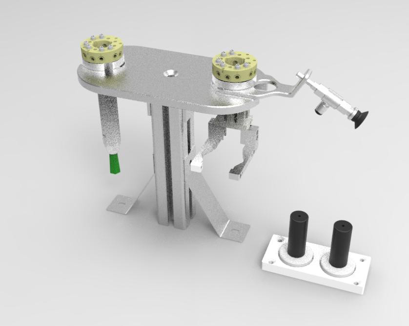 機(jī)器人末端工具是機(jī)器人的執(zhí)行單元,如圖 8 所示此模塊包括尖點(diǎn)輔助工具、筆工具、氣動(dòng)夾爪工具和氣動(dòng)吸盤(pán)工具。尖點(diǎn)輔助工具形狀為圓錐,具有TCP 校準(zhǔn)功能,同時(shí)可以模擬去毛刺、涂膠工具。筆工具、夾爪工具和吸盤(pán)工具都配備了機(jī)械快換工具,與機(jī)器人法蘭盤(pán)的機(jī)械快換工具配套使用,可實(shí)現(xiàn)工具的快速更換。筆工具內(nèi)部設(shè)置有緩沖裝置,可以有效減少學(xué)生初步學(xué)習(xí)機(jī)器人操作時(shí),由于不熟練導(dǎo)致剛性碰撞產(chǎn)生對(duì)工具的損壞。筆工具可以完成軌跡、寫(xiě)字和繪畫(huà)等實(shí)驗(yàn)內(nèi)容,彩筆可快速更換。夾爪工具和吸盤(pán)工具采用國(guó)際知名品牌, 用于物料的抓取和吸附。