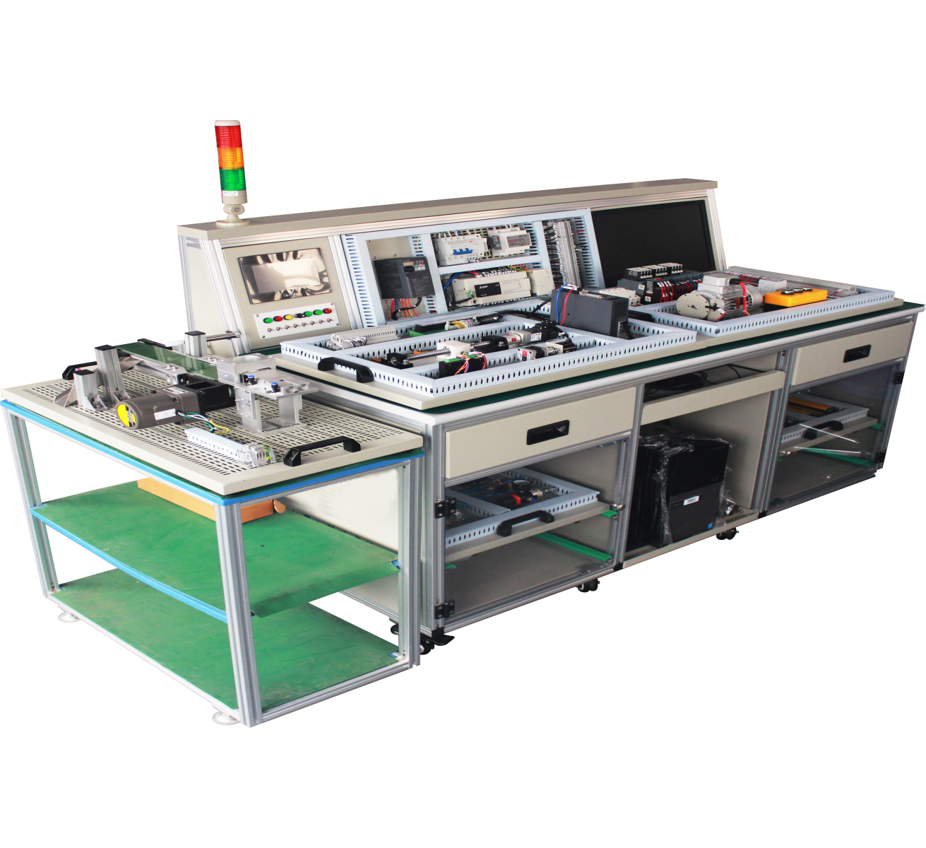 工業(yè)機(jī)器人自動化綜合實(shí)訓(xùn)平臺為模塊化開放式設(shè)計結(jié)構(gòu),主模塊可作為獨(dú)立的實(shí)訓(xùn)系統(tǒng)單獨(dú)使用,也可通過標(biāo)準(zhǔn)接口與電工實(shí)操、電氣控制、氣動控制、伺服步進(jìn)、傳感檢測、機(jī)械拆裝等子模塊組合,構(gòu)成不同功能的自動化控制實(shí)訓(xùn)項(xiàng)目。各種電氣元器件、機(jī)械構(gòu)部件、系統(tǒng)運(yùn)行狀態(tài)具有直觀性,功能具有可擴(kuò)展性,應(yīng)用具有安全性。工業(yè)機(jī)器人自動化綜合實(shí)訓(xùn)平臺可用于自動化電氣部件、氣動部件、伺服電機(jī)、步進(jìn)電機(jī)、變頻器、傳感器、可編程控制器、觸摸屏等工業(yè)控制系統(tǒng)中*常用的設(shè)備的安裝、接線、調(diào)試,可開展自動化相關(guān)控制技術(shù)的實(shí)訓(xùn)。