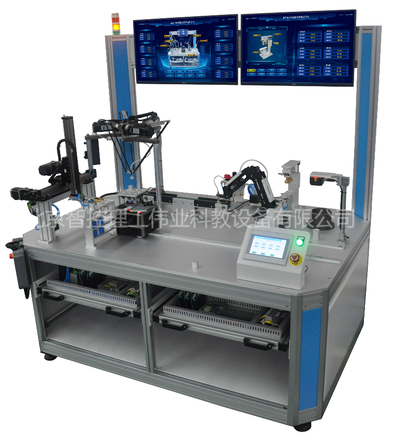 裝置是一套可以模擬一個智能化車間生產運行的綜合性應用系統,整個裝置可以實現從立體倉庫管理、智能小車輸送、機器人搬運、模擬加工、視覺檢測、數字化信息采集、可視化數據監(jiān)控、工業(yè)互聯網應用開發(fā),實驗裝置流程可實現由并聯機器人取料-傳輸-多軸機械手搬運-加工-檢測-智能車運輸-立體倉庫存的正向流程,配套的數字孿生系統可以實現與實物機構的實時同步運動,系統由分布式組合控制方式可以開展單機應用實訓,也可以開展組合控制實訓。