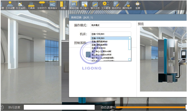 LGS-SX02型 數(shù)控車銑加工一體化創(chuàng)新仿真實訓平臺的數(shù)字孿生機床仿真部分,操作極為簡單,放大、縮小、旋轉(zhuǎn)、平移、觸控等等。學生無需特殊訓練,即可直接上手使用??芍С职ㄈS的數(shù)控機床如法蘭克、西門子、華中、廣數(shù),以及多軸的數(shù)控機床如西門子840D、華中848D、海德漢TNC640等主流操作系統(tǒng),支持加工中心、車床、斜床等數(shù)控機床設備,目前數(shù)控I8多軸智能訓練機包含了11套不同類型數(shù)控系統(tǒng)設備。