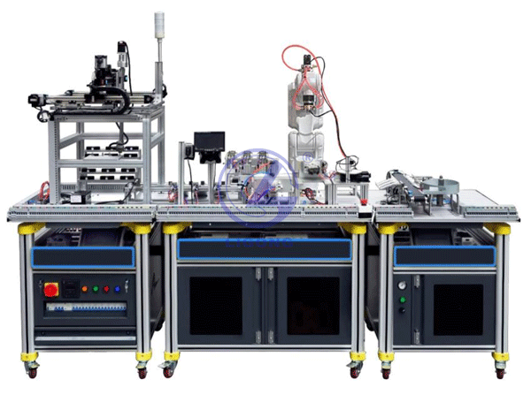 LGY-JD05B型 通用機電設備安裝與調(diào)試實訓裝備主要由實訓臺架、典型的機電設備的機械部件, 電氣控制單元等組成。典型的機電設備的機械部件主要包括供料機構、傳送帶輸送分揀機構、工業(yè)機器人、直角坐標機械手、立體倉庫以及可擴展的模擬生產(chǎn)設備實訓模塊等; 電氣控制單元主要有電源配電、PLC 可編程控制器、觸摸屏、變頻器、步進電機控制、伺服電機控制、按鈕指示燈、接線端子及各種檢測傳感器等部分組成。整體結構采用開放式和拆裝式,可根據(jù)現(xiàn)有的機械部件,以模塊化的方式組裝和搭建具有生產(chǎn)功能的智能生產(chǎn)線設備,也可添加其它機械部件組裝其他生產(chǎn)設備,使整個裝置能夠靈活的按教學實訓要求組裝具有模擬生產(chǎn)功能的智能生產(chǎn)線設備。