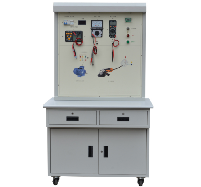(1)實訓臺主體部分采用全鋼結構,鋼板亞光噴塑,美觀耐用,臺面采用鋁塑板印制而成,整個實訓臺由漏電保護開關、熔斷器、開關電源、數顯計時器、智能刷卡啟動電路板、數字兆歐表、交流接觸器、指針萬用表、數字萬用表、照明日光燈、帶鎖開關、按鈕開關、電動機、磨光機和安全接線柱等組成。