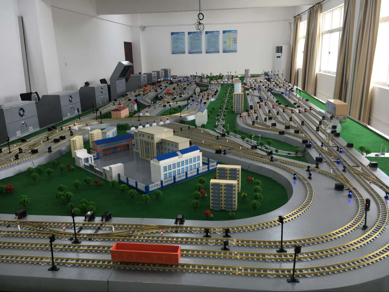 4、沙盤(pán)性能:整個(gè)沙盤(pán)由獨(dú)立的多塊板材拼裝組成,骨架與臺(tái)面鉚接成形,整個(gè)沙盤(pán)平穩(wěn)結(jié)實(shí),受力均勻,具有100%受重冗余度,滿(mǎn)足沙盤(pán)制造、維護(hù)及清潔的需要。枕木與路基精雕制作,枕木、路基均勻,所有材料經(jīng)干燥、防蟲(chóng)處理,不變形不生銹不開(kāi)裂。沙盤(pán)不銹鋼圍邊,保證沙盤(pán)外觀(guān)美觀(guān),整個(gè)沙盤(pán)下部密閉良好,設(shè)備維修方便,沙盤(pán)線(xiàn)路整裝在線(xiàn)合內(nèi),保證沙盤(pán)消防安全及防鼠安全。
