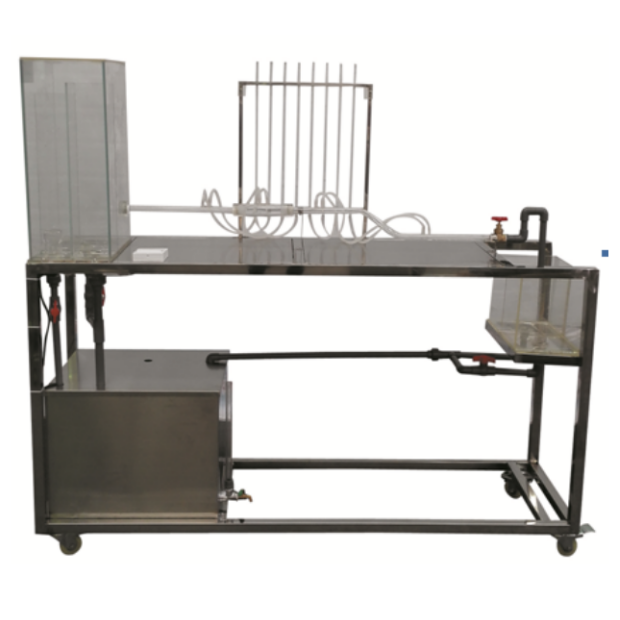 蓄水箱、水泵、有機玻璃實驗水箱、有機玻璃計量水箱、刻度標尺、秒表、玻璃溫度計、測壓管、閥門、不銹鋼框架。