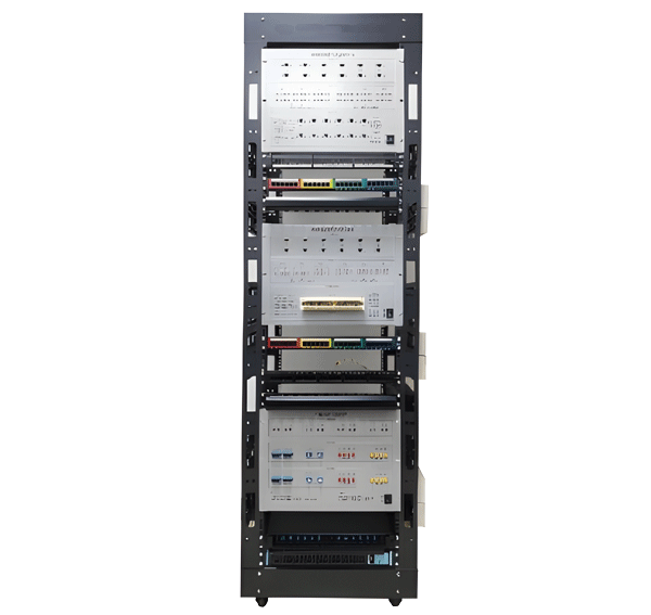 3、結(jié)構(gòu):設(shè)備為19英寸38U開放式機(jī)架結(jié)構(gòu),全鋼結(jié)構(gòu),采用1.5mm冷軋鋼板,噴塑處理,防火防靜電、落地安裝、立式操作;立柱板孔采用標(biāo)準(zhǔn)化處理,能夠安裝各種符合標(biāo)準(zhǔn)的IT工程網(wǎng)絡(luò)設(shè)備的安裝;配置智能語音播放系統(tǒng)一套,可以自動播放語音解說詞,方便實(shí)訓(xùn)教學(xué)。