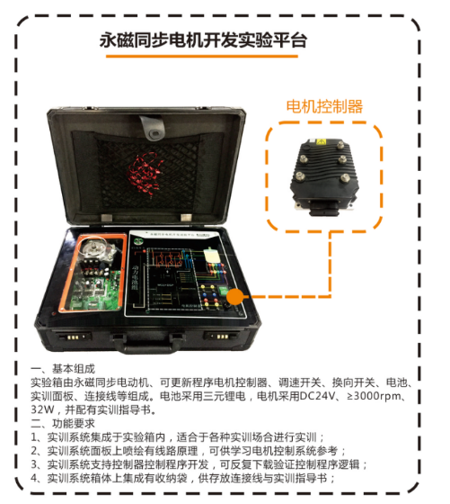 實驗箱由永磁同步電動機、可更新程序電機控制器、調(diào)速開關(guān)、換向開關(guān)、電池、實訓面板、連接線等組成。電池采用三元鋰電,電機采用DC24V、≥3000rpm、32W。