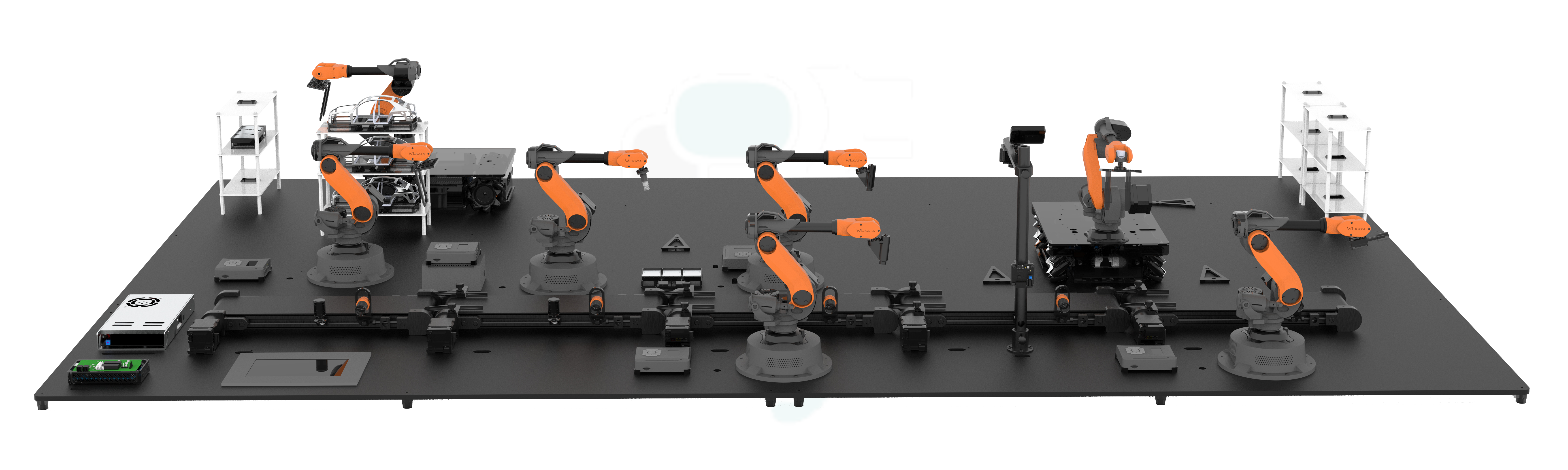 桌面六軸機(jī)器人*5;復(fù)合移動(dòng)機(jī)器人*2;AI視覺(jué)套件*1;傳送單元*5;人機(jī)交互屏*1;配件包*1