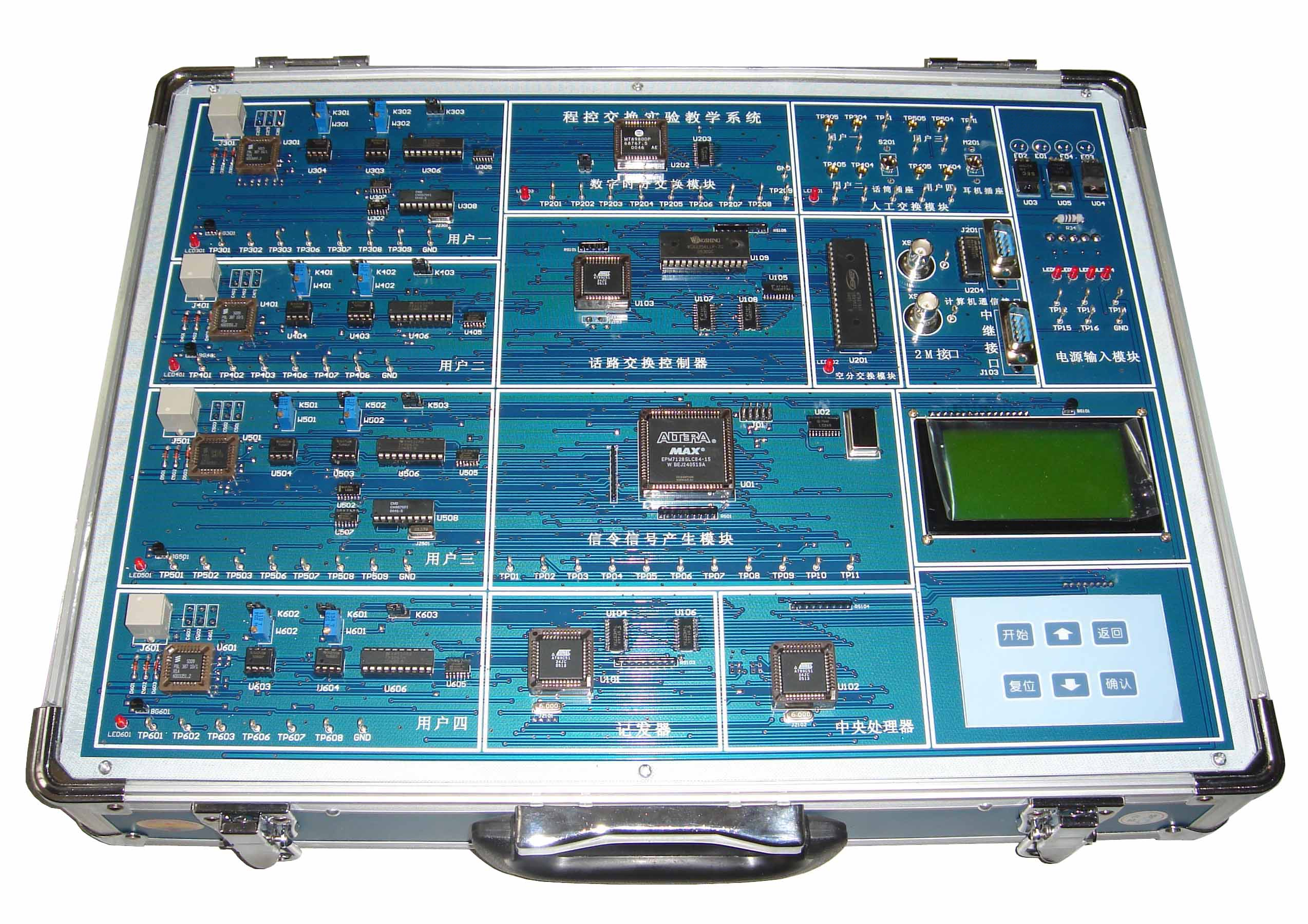 8、CPU中央處理器及控制檢測(cè)電路,主要由CPLD可編程器件EPM7128、鎖存器74HC573等組成,在實(shí)驗(yàn)箱軟件的作用下,完成對(duì)話機(jī)狀態(tài)的監(jiān)視、信號(hào)音及鈴流輸出的控制、電話號(hào)碼的識(shí)別、交換命令發(fā)送。