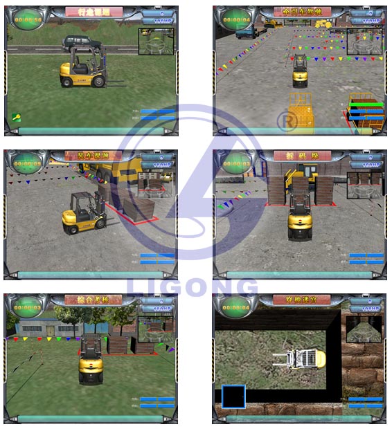 ★裝載機(jī)模擬機(jī)課題數(shù)目共5個(gè):行走、移庫(kù)、裝車、平整、打堆。叉車模擬機(jī)課題數(shù)目共6個(gè):行走、牽引車、拆垛碼、裝車、綜合考核、娛樂(lè)教學(xué)。