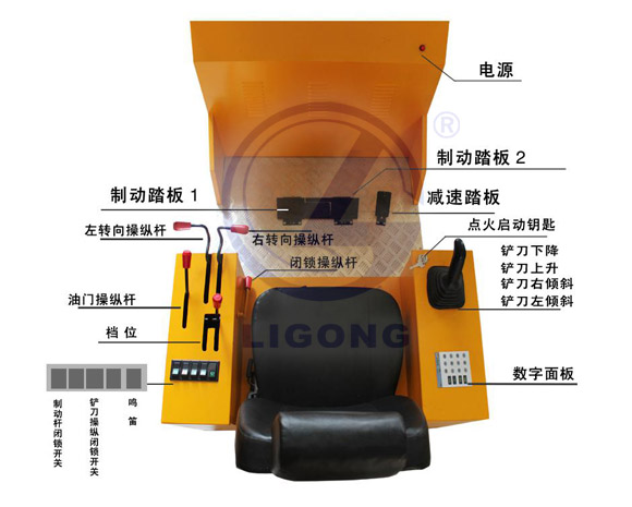 3.擁有左右行走踏板、減速踏板、鏟刀控制手柄、操縱箱、手拉式方向總成、檔位控制器、檔位閉鎖桿、油門拉桿、高集成數(shù)據(jù)電路板及各種功能調(diào)節(jié)組件等組成,操作時(shí)在視屏上顯示輸出與操作相對(duì)應(yīng)的逼真三維場(chǎng)景并伴有相應(yīng)語(yǔ)音提示;